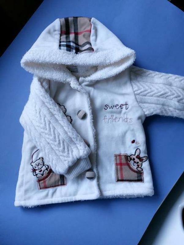 Дуже тепла кофтинка, розмір вказано 62 см, але це не так. Вистачить до року точно.