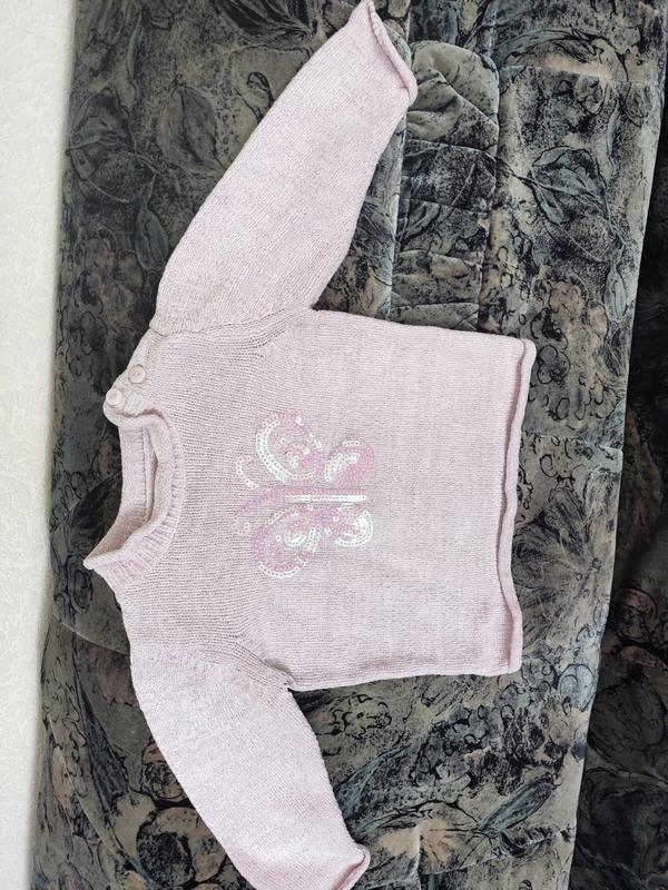 Ніжно-рожевий светр з блискучою ниткою, нитка проходить тільки зовні і вона не колючий, дуже м'який та приємний до тіла, на плечі є гудзики для зручності проходження голови.