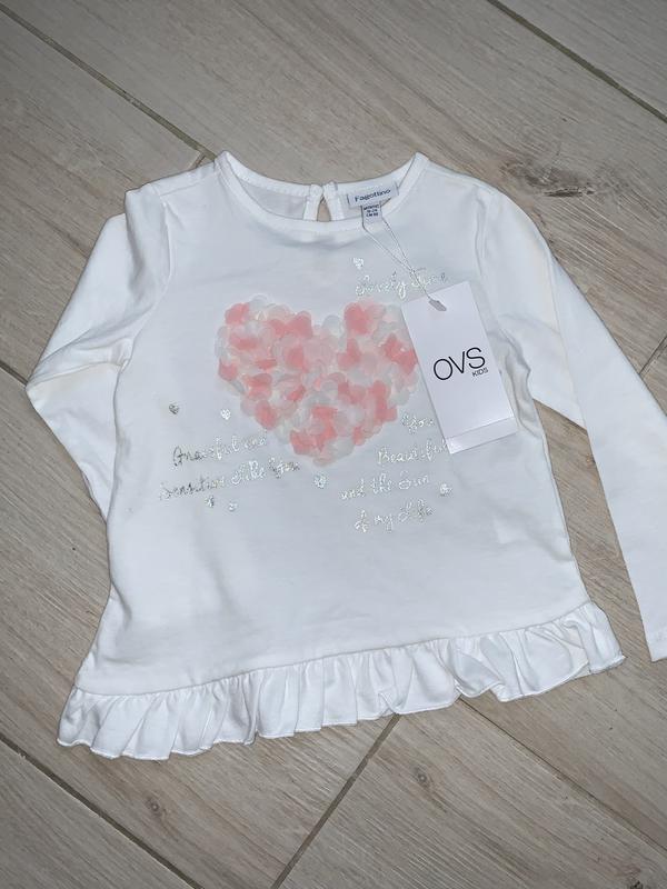 Дуже красивий милий лонгслив від OVS kids з декором на грудях, сріблястим принтом, і асиметричним низом з рюшами. М'який бавовняний трикотаж. Довжина по спинці по центру 34см Рукав 31,5 см ПОГ 28см.