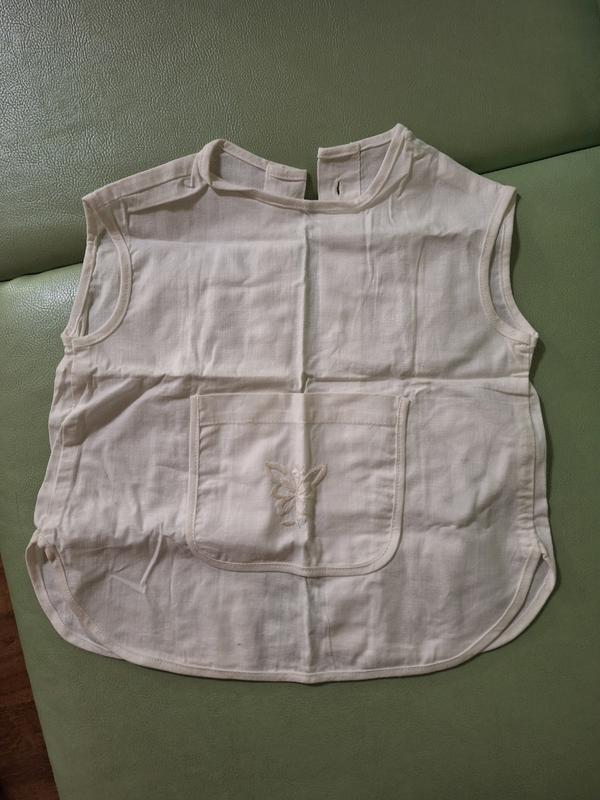 Це дитячий лляний нагрудник кремового кольору з вишивкою метелика. Позаду на гудзиках. Пвраметри: довжина - 25, напівширина - 32, Ціна 120 грн