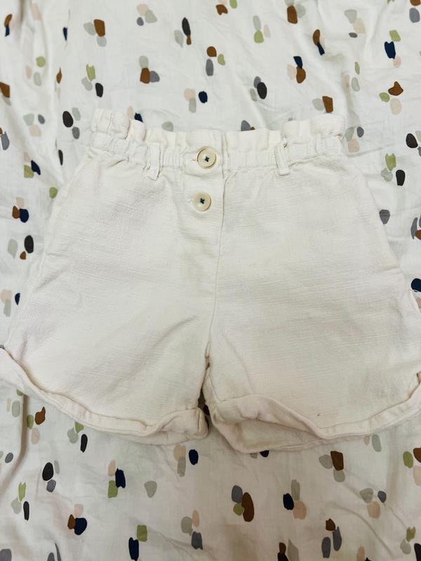Дуже класні шорти Zara, ідеальний стан Можна підгорнути, можна відпустити штанину Вік: 9-12 міс Зріст: 80 см Молочний колір, натуральний