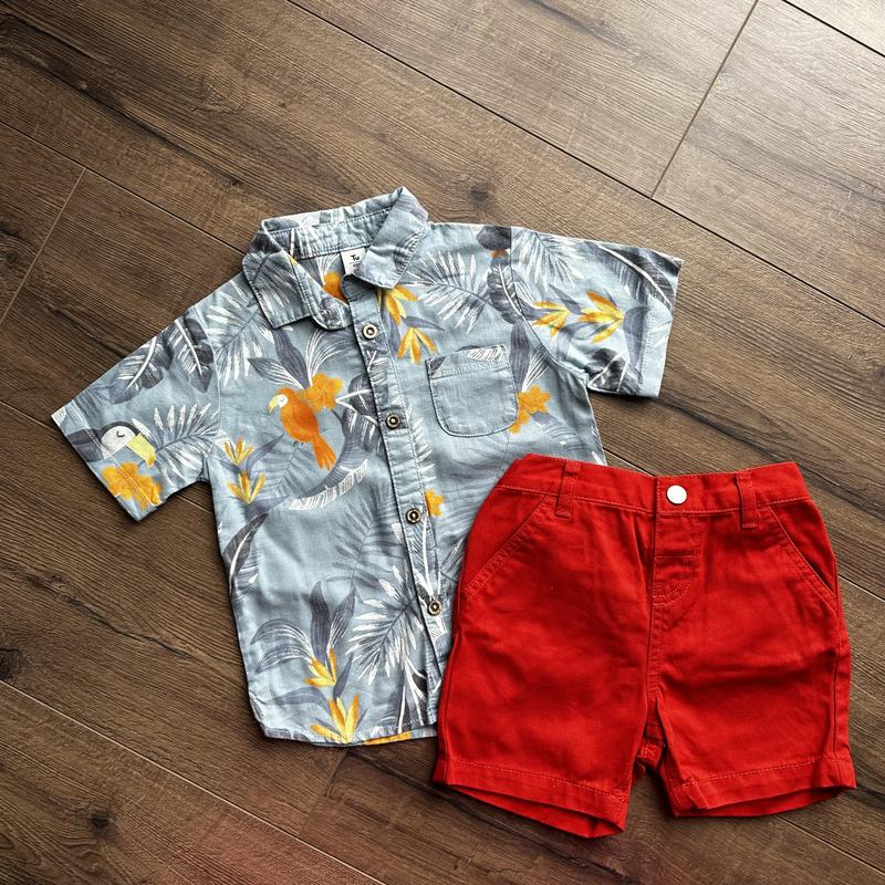 Класний набір для хлопчика на вік 12-18 місяців. Шорти фірми F&F. Пояс 25 см, довжина 24 см. Рубашка фірми TU. Довжина 36 см, плечі 23,5 см, ширина 29 см.