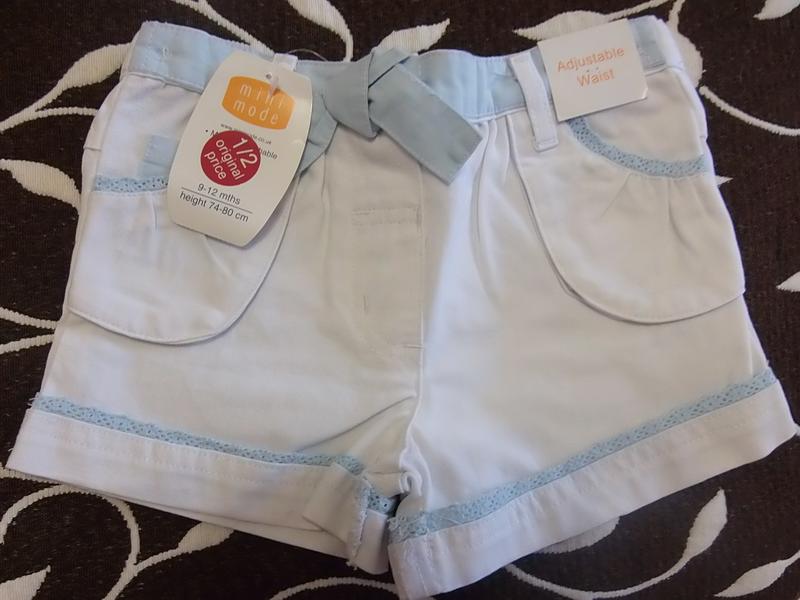 Шорти літні (100% бавовна) на дівчинку 1 року, фірми Mini mode. Заміри: довжина 20 см, напівобхват пояса 25 см (всередині регулюються), стегон 29 см.