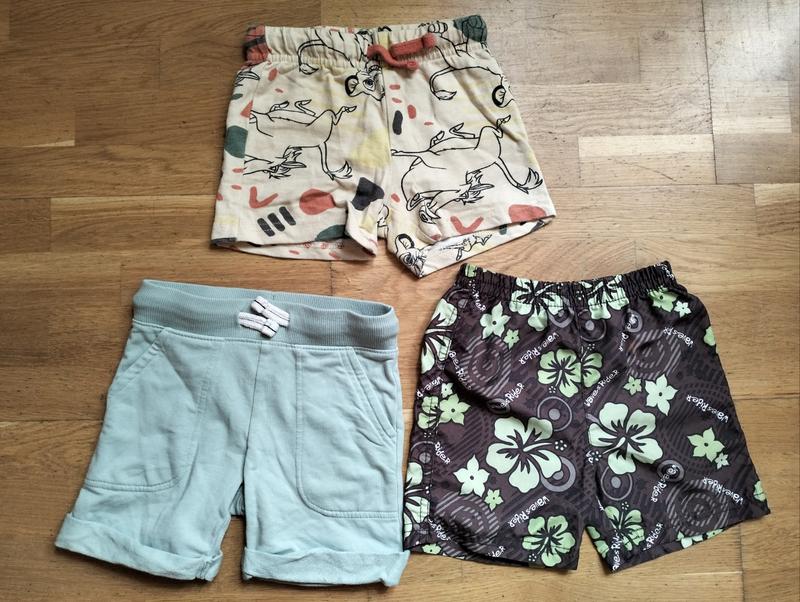 Комплект літніх шортиків на хлопчика 1-2років, + подарунок. Продаю тільки комплектом 3шт. В подарунок шорти на останніх двох фото. Є невелика дірочка. Речі різних форм, на один вік: 1-2роки.