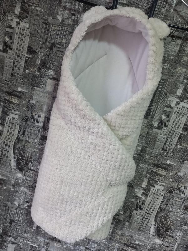 Плюшевий конверт з вушками. Застібка-липучка. Можна використовувати як плед (70×70). На останньому фото видно нюанс! (світле жовта пляма всередині конверта в області ніжок). Колір дуже ніжний, ближче до айворі, світліше, ніж на останніх фото, камера трохи спотворює.