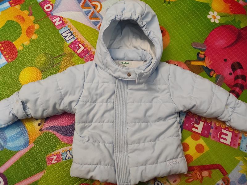 Куртка на холодну осінь або теплу зиму. Рукавички кріпляться на ґудзики, капюшон з резинкою для щільнішого прилягання до голови. Капюшон на кнопках. На 3 – 6 місяців, детальні заміри на фото.