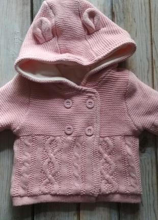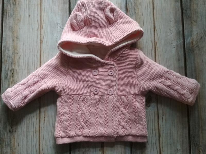 Дуже тепла кофта на новонароджену дівчинку. Капюшон з вушками, за стібка на 4 гудзики. Довжина по спинці 23см. Пахви 22см. Рукава 17см. Відповім на всі питання. Зроблю додаткові фото.