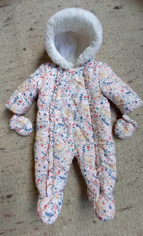 Комбез в хорошому стані. Заміри на фото. Носили один сезон ( нашій малій було 5 - 7 міс.) Теплий (на половину спинки на хутрі). Дуже ніжна забарвлення. Руковички на липучках. Одна блискавка (йде в ліву ніжку), кнопка Вгорі. Капюшон Добре сидить на голівці. Є шапочка, яка добре поєднується з ним( якщо зацікавить можу надіслати більше фото її). Ми носили з задоволенням.