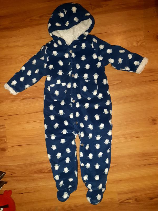 Тепленький комбезик на ріст 74-80см. Сверхк фліска, всередині хутро. Довжина виробу 74см, довжина до памперса 41см, крок 30см, плечі 23,5 см, ширина пахви 32см, рукав від плеча 29,5 див.