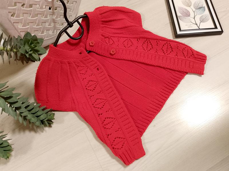 В'язана жилетка для дівчинки. Колір червоний. Розмір не вказано. Лінія грудей 25 см. Загальна довжина 33-35 см. Застібка два пластикові гудзики. Наявность ковтунців.