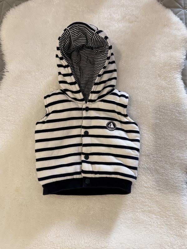 В ідеальному стані продаю дит. жилетку Petit Bateau утеплену двусторонню, на кнопочках, з капішоном, підходить для дівчинки, і для хлопчика Довж. жилетки-27см Пів обхват. в плечах-20см Пів обхват. В грудях-28см