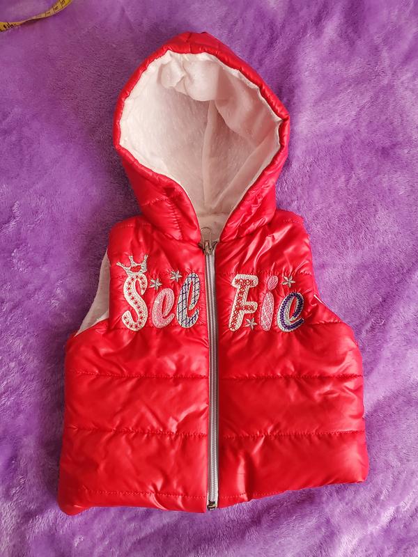 Тепленька безрукавочка для дівчинки яскравого червоного кольору на синтепоні, мякенька, з капюшоном, на замочок. Стан ідеальний. Замок робочий, носили мало, на наш вік було не по сезону. Заміри є на фото. Дивіться інші мої цікаві речі для діток і дорослих.