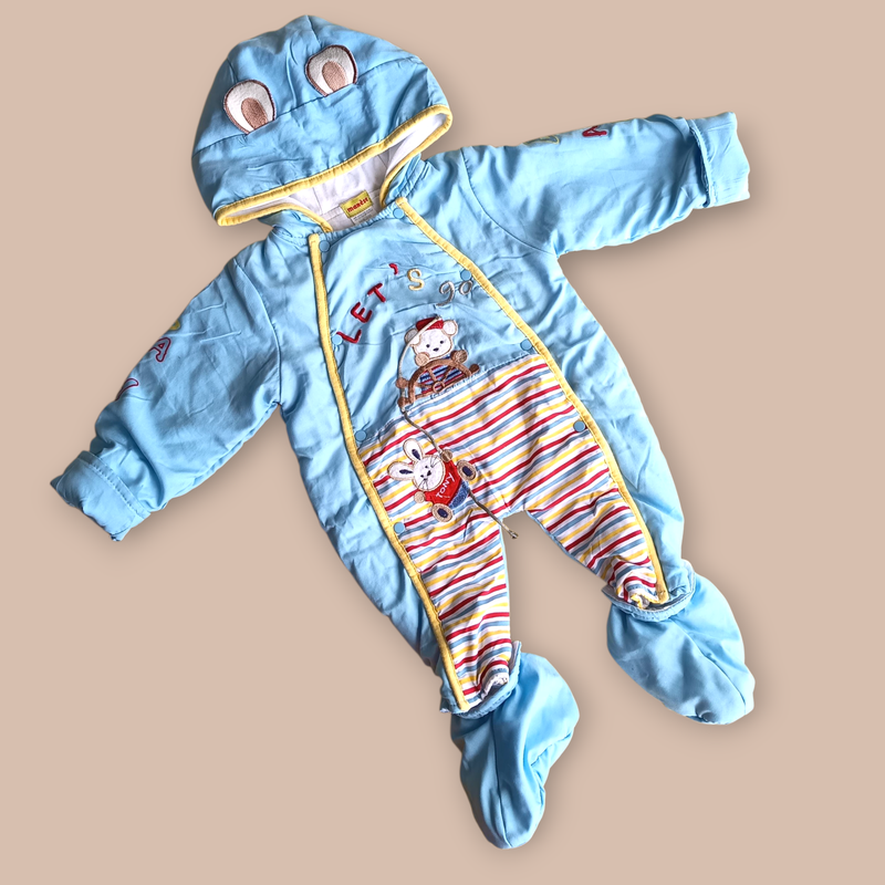 💙 Теплий комбінезон для малюка на 3 місяці 💙 М’який і зручний комбінезон блакитного кольору з капюшоном та вушками 🐰 На х/б підкладці — приємний до тіла, підходить для прохолодної погоди (весна, осінь). 📏 Розміри: — Довжина без пінеток: 45 см — З пінетками: 50 см — Ширина: 30 см — Рукав: 26 см — Стопа: 12 см Стан гарний 💰 Ціна 130 грн