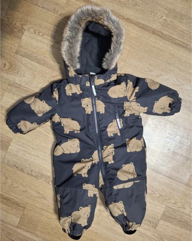 Зимовий комбінезон H&M розміру 68 на 4-6 міс, але ми носили до 8 міс, бо він великомірить. Дуже теплий, гарна цупка тканина, на флісі, каптур знімається. Стан ідеальний, стан нового, відповідно без потертостей, замки, ризинки цілі, все працює. Заміри: ог-72, довжина від коміра до низу-59, довжина від коміра до матні-44, ніжки довжина-20,