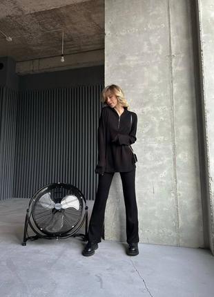 Жіночий чорний теплий брючний костюм: кофта і широкі штани, ангора рубчик