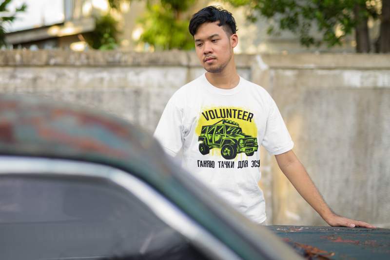 Футболка з патріотичним принтом "volunteer. ганяю тачки для зсу" push it