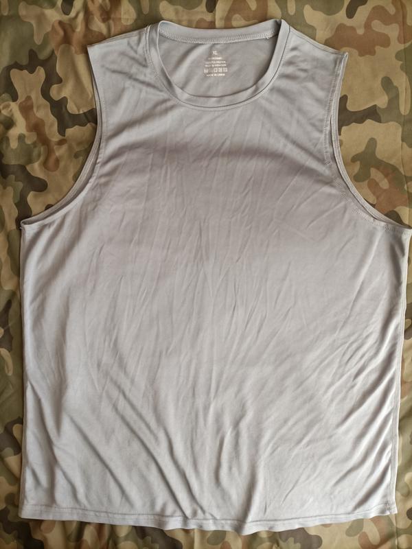Пропоную якісну майку. Тканина технологічна, двошарова типу coolmax. Стан - без слідів носіння. Сірий колір. Плоскі еластичні шви. Тканина дуже добре тягнеться. Фактичні заміри у нерозтягнутому стані: ширина під пахвами 59см, довжина по спині 73см.