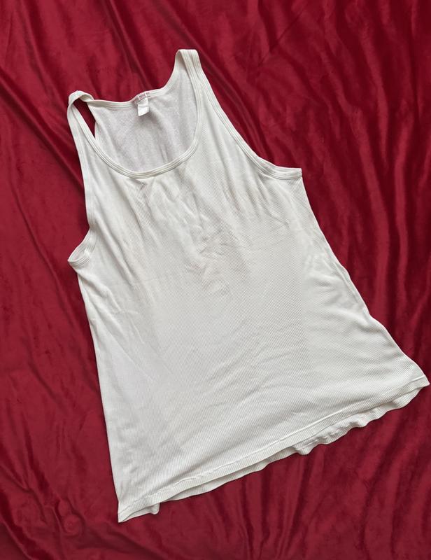Майка біла в рубчик великий розмір/ Тягнеться,щільність середня/ Довжина 75-80 см/ Плечі 28 см/ Пог 50 см/ Пот 49,5 см/ Знизу 63 см/ З нюансів-розтягнення та плями і під руками рваність все видно на фото ,у ціні враховано/ Продається без повернення/