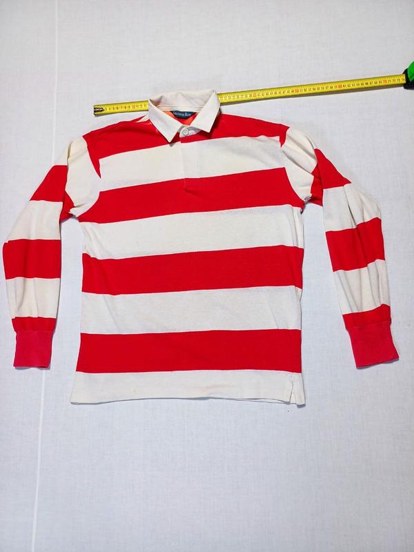регбійка поло з довгим рукавом Christopher Hayes розмір M (дивитися заміри) Заміри напівобхват: 1) плечі 45 см 2) між пахвами 54 см 3) довжина по спинці від коміра до низу 70 см 4) рукав від плеча до краю манжети 60см 5 )пояс 50 см