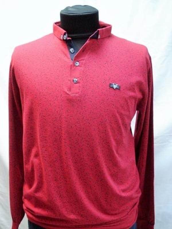 Футболка чоловіча з довгим рукавом Комір стійка з оздобленням, переходить у планку на ґудзиках. Низ футболки та рукави на манжеті. Тканина дуже м'яка, приємна до тіла. Тонкий трикотаж. Склад 95% котон, 5% еластан. Колір червоний у дрібний малюнок. Виміри для 3XL: плечі - 50, ПОГ - 56, низу - 47, довжина рукава від горловини - 77, від плеча - 63, довжина - 70.