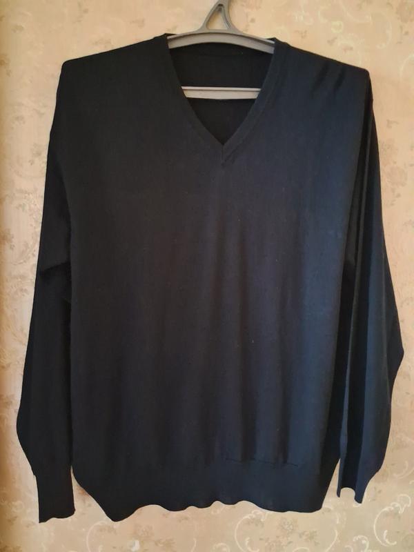 тонкий, теплий, темно-синього кольору. Довжина від плеча 74см, ширина-60см, рукав 61см.Нюанс: на рукаві біля плеча дуже акуратно зашита дірка 2 мм, зовсім непомітна. В подарунок чорна майка того ж розміру !!!!