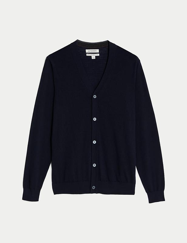 ID продукту: T30/3642M Цей кардиган із v-подібним вирізом із нашої колекції Autograph виготовлений із чистої надзвичайно тонкої мериносової вовни. Він ніжний на шкірі, стійкий до запахів і легко прати. Autograph: преміальні інвестиційні вироби з сучасним кроєм і вишуканими штрихами. Колір: флот В плечах 45, ног 65, нон 55, довжина по спинці 74, рукав 72.