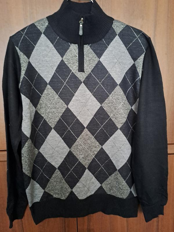 Мужской джемпер с застежкой на короткую молнию. Стойкий воротник эластичной машинной вязки плотно облегает шею и будет создавать комфорт в холодную погоду. Основной цвет - темно серый ( графит). Передняя сторона с классическим принтом в ромбы родственных цветов. Сейчас этот принт снова в тренде. Размер от производителя- M, но лучше ориентироваться на замеры. Пог.- длина-, длина рукава-. 60% коттон, 40% полиэстер. Сток. Состояние новой вещи.