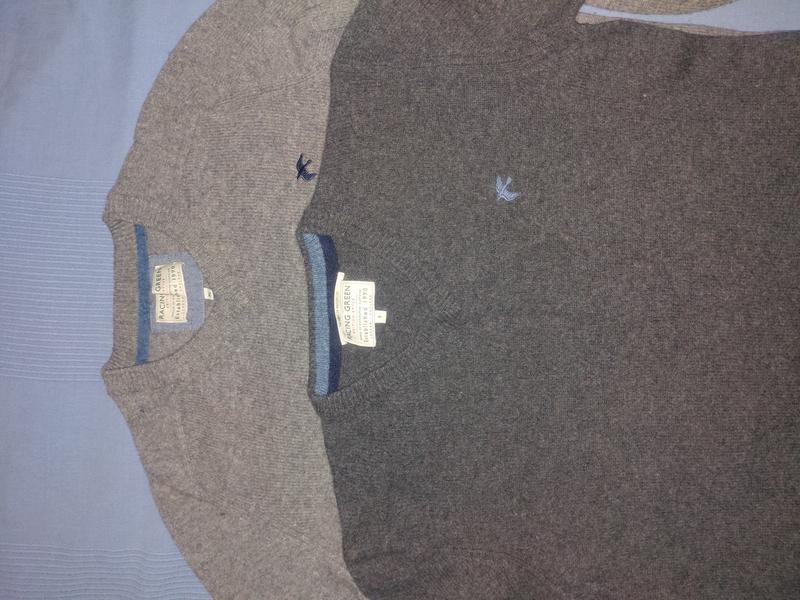 Два джемпера теплих. Склад джемпера 80% вовни ягня і 20 відсотків нейлон. Написани розміри L I XL.Але вони абсолютно однакові за вимірами.Але трохи різні форми рукавів в плечах. НОГ-51,5 см.Довжина 64 см,довжина рукава 64,5 см.Кольори свіло-сірий і темно-сірий. На грудях вишивка у вигляді птаха. З недоліків є трохи "катишок". Вартість вказана за один.