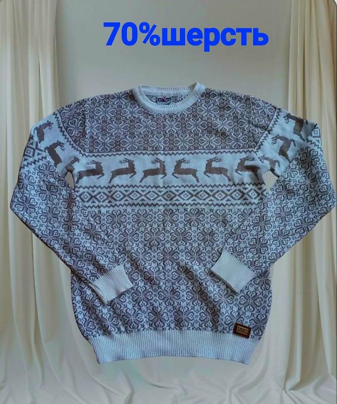 Тип: В'язаний светр з круглим вирізом Колір: Переважно світлий (молочний або світлий) з візерунками темнішого відтінку( капучіно-коричневий). Візерунок: Має скандинавський або різдвяний орнамент, що включає стилізовані фігури оленів та геометричні візерунки. Олені розташовані горизонтальною смугою на грудях, а решта светра прикрашена повторюваним геометричним малюнком. Деталі: Манжети та низ светра виконані резинкою. На нижньому краю є невелика нашивка Стиль: Теплий, повсякденний, підходить для осінньо-зимового сезону або святкових подій. Стан відмінний, якість супер Заміри, ПОГ 50-52 до 56 Довжина 68 Довжина рукава 63 Оплата на карту приват, відправка будь якою поштою впродовж трьох днів