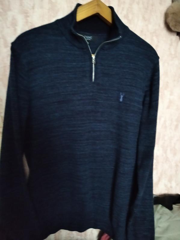 Идеальное состояние, молния у горловины, воротник стойка , на рукавах,по низу и воротник - резинка. Размер M, плечи 47-48, Пог 57-59( ткань легко тянется), рукав 67, длинна 68. Ткань средней плотности, 60% Коттон, 40% полиэстер. Цвет темно-темно синий.