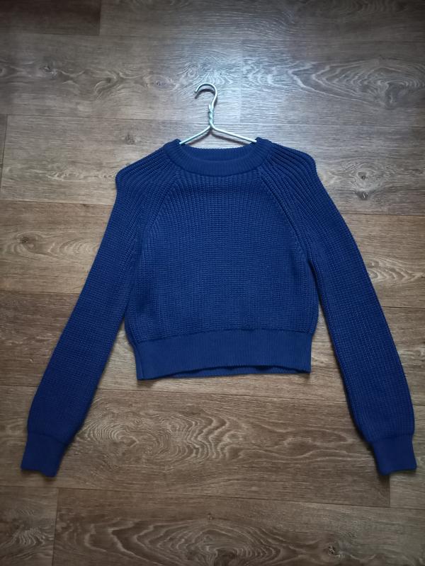 Джемпер (укорочений светр) має глибокий темно-синій колір. Підійде на розмір XS - S. Довжина - 47 см, рукав - 62 см, напівобхват грудей - 41 см, низ - 38 см.