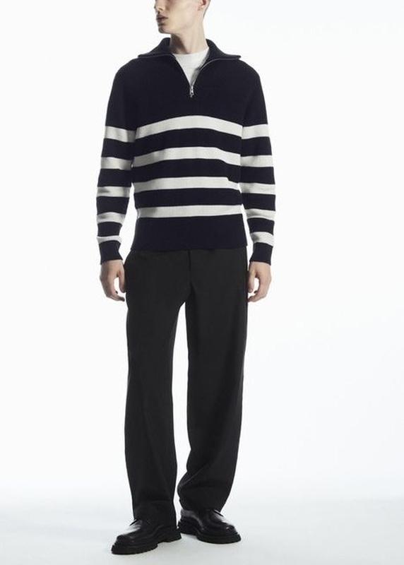 стильний джемпер з напів блискавкою з вовни та бавовни Cos у смужку Розмір L Ідеальний стан 65% вовни і 35% бавовна Заміри Довжина від горловини 63 Довжина від плеча 68 ПОГ 57 ПО низ 51 Плечі 45,5 Рукав 65 Горловина 14 Блискавка 28