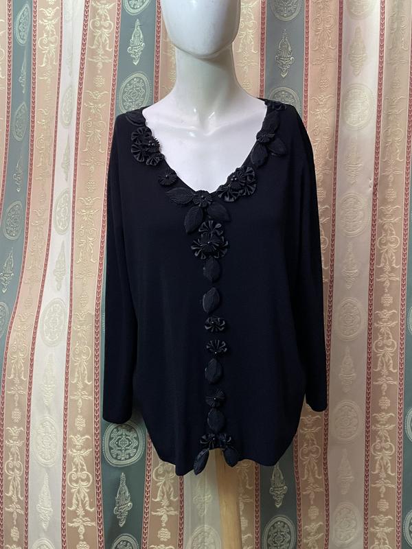 Рукав з плечем 62 см ПОГ 56 см Довжина 64 см Жіноча чорна блуза вільного крою з довгими рукавами. V-подібний виріз, декорований об'ємними чорними аплікаціями у вигляді квітів і листя, які спускаються вертикально по центру виробу