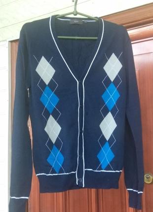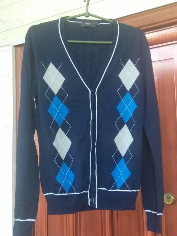size 💧R I L E Y💧 бавовна S/M котон НОВИЙ чоловічий трикотажний котоновый джемпер, V-образний виріз горловини, на гудзиках у кліт- ку аргал від RILEY. Темно-синій з блакитними і білими ромбами. Поєднується з джинсами і класичними брюками. Можна одяг -нути на гольф або футболку. ⚡ Відтінок на фото може відрізня- нятися від реального з-за особли- востей передачі кольору. 👇 Обов'язково ДО покупки звірте заміри: Довжина 65 см ПОГ 49 см ПОТ 46 см Рукав 83 см від горл. ПО рукава 36 см Глибина вирізу 25 см Гумки 6 см ◠‿◕ З нетерпінням чекаю на моїй сторінці. Бажаю вдалих покупок і супер настрою.