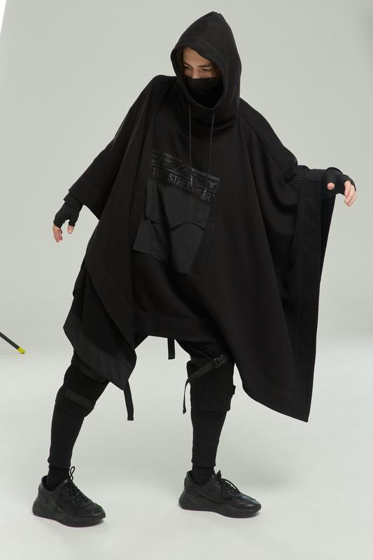 Розміри: універсальний Колір: чорний Тканина: 95 % коттон, 5% поліестер Особливості моделі: - Пончо вільного крою, - Капюшон з високою горловиною зі шнурком, - Накладний карман кенгуру із тканини жатки, - Дві внутрішні кишені, - Принт чорного кольору з логотипом, назвою бренду та абстракцією.