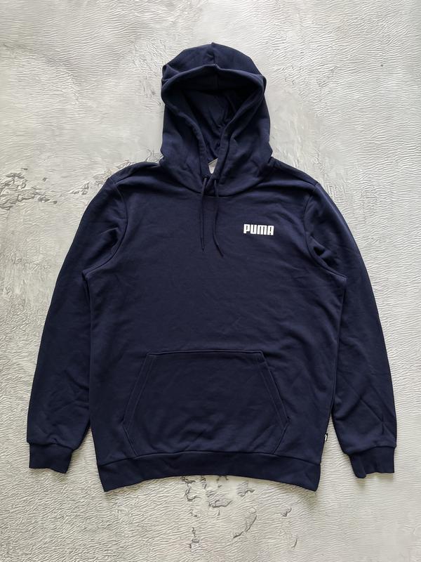 Худі Puma темно-синього кольору. Модель класичного крою з капюшоном на зав’язках і великим кишенею-«кенгуру» спереду. На грудях розташований білий логотип Puma. Манжети та низ виробу на еластичних резинках, що забезпечує комфортну посадку. Тканина м’яка та приємна до тіла, підходить для повсякденного носіння та спорту.