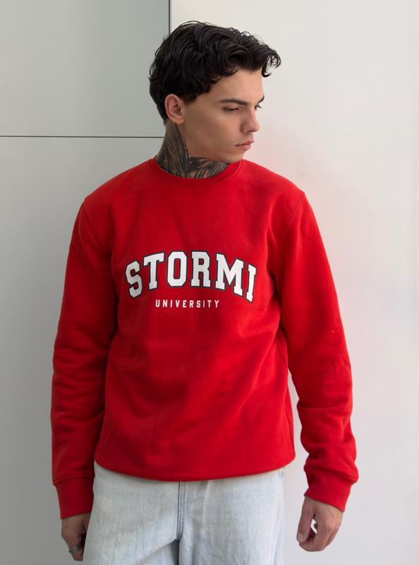 Характеристики: • Колір: червоний • Принт: напис STORMI UNIVERSITY • Стиль: casual / streetwear / college style • Матеріал: бавовна + поліестер (м’який, теплий, зносостійкий) • Фасон: regular fit • Манжети та низ на резинках • Горловина: круглий виріз Переваги: • Яскравий колір, що виділяє серед натовпу • Стиль “college”, натхненний американськими університетами • Комфортний у носінні, добре поєднується з джинсами чи спортивними штанами • Унісекс — підходить хлопцям і дівчатам Розмір: підходить на M
