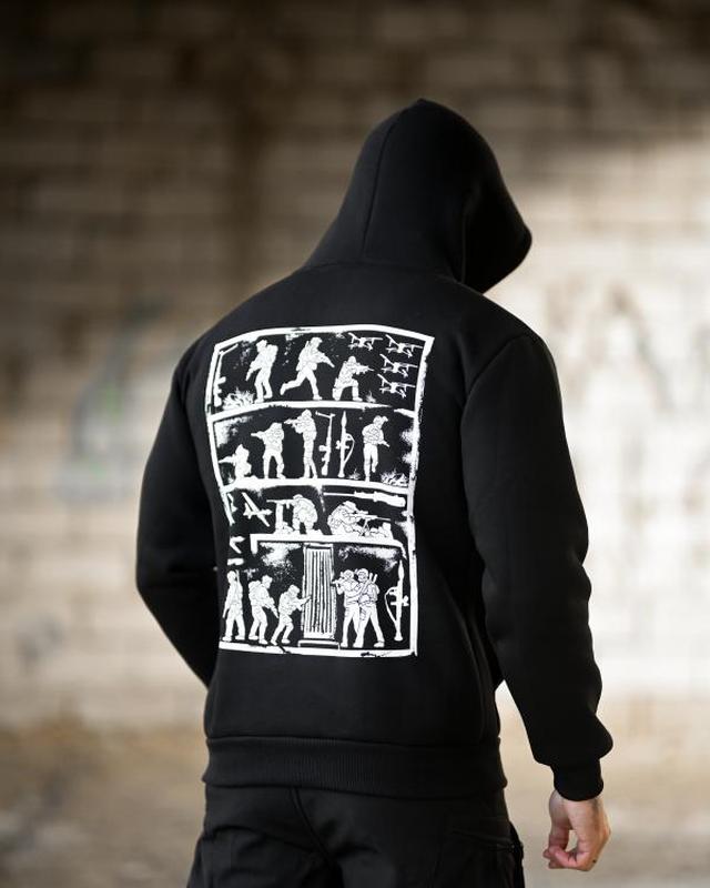 На модели: размер М, рост 175 см, вес 75 кг Материал: трикотаж на флисе (Турция) Склад: 95% бавовна, 5% еластан Малюнок: TDF принт (термоперенос) Посадка: полномерная Худи GENESIS — это сочетание уличного стиля и воинского характера. Изготовлено из плотного турецкого трикотажа на флисе - ткань сохраняет тепло, остается мягкой и приятной к телу. Эластичные манжеты и низ обеспечивают комфортную посадку, а яркий TDF-принт на спине делает изделие выразительным и уникальным. Отличный выбор для тех, кто живет в ритме улицы, но остается готовым к бою в любой момент. Размерная сетка:Размер Плечи (см)Груды (см)Рукав (см)Довжина (см)M50515962L5155XL525763672XL565864693XL59606571Особенности: Плотный трикотаж на флисе (Турция) - тепло, комфорт и долговечность. TDF-принт – устойчив к стирке, не трескается и не выгорает. Универсальный черный цвет и уникальный арт на спине. Эластичные манжеты и пояс - идеальная посадка по телу.