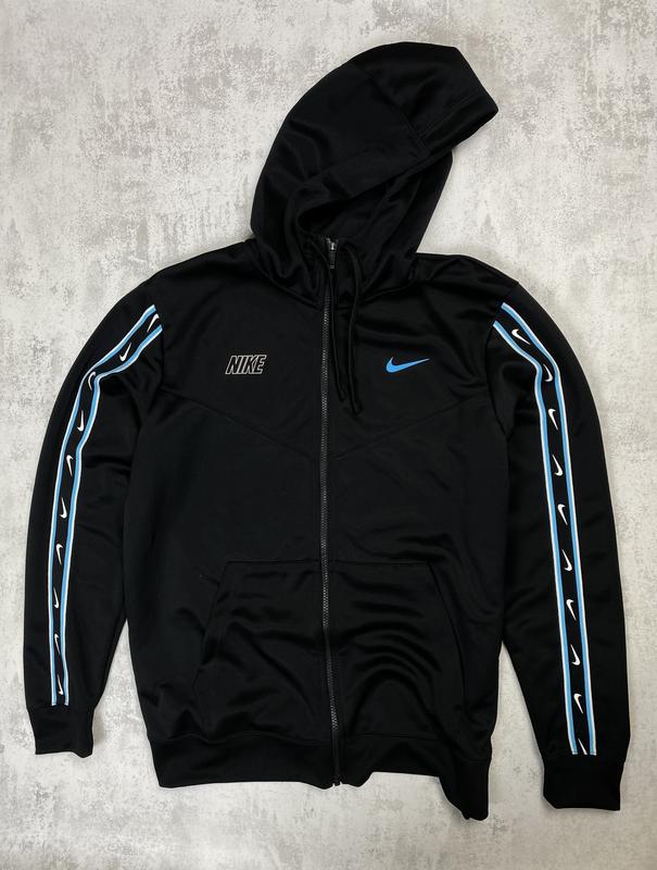 Розмір по бірці Л, також добре підійде на ХЛ Спортивне чоловіче худі (толстовка з капюшоном) Nike на повній блискавці. Виконане у чорному кольорі. Головна особливість – ефектні контрастні лампаси (Repeat Tape) з повторюваним логотипом Swoosh (галочка) на рукавах, виділені блакитною та білою смужками. Фірмовий блакитний логотип-свуш на грудях.