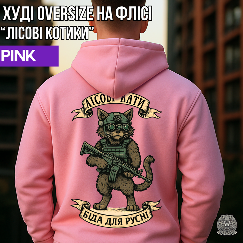 Унісекс худі oversize (чорний/рожевий) з принтом "лісові котики" на флісі