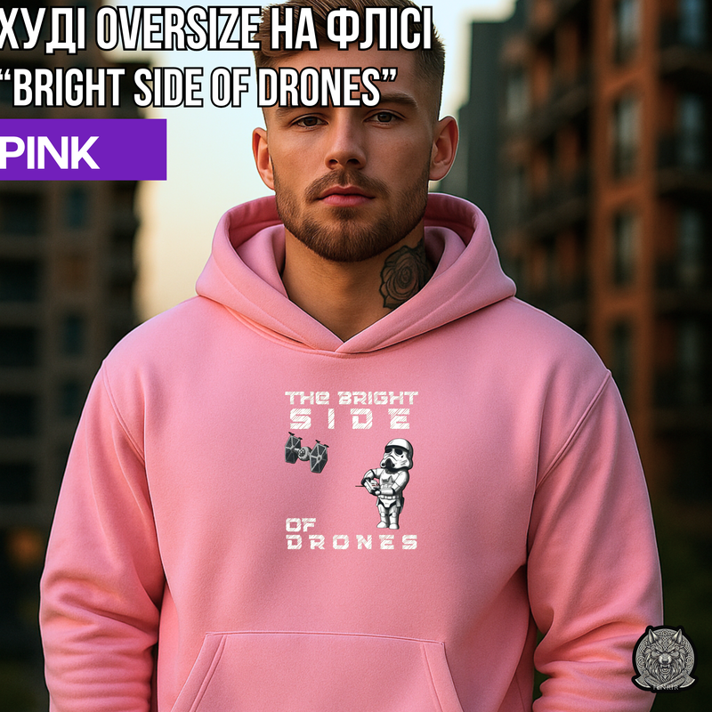 Унісекс худі oversize (чорний/рожевий) з принтом "the bright side of drones" на флісі