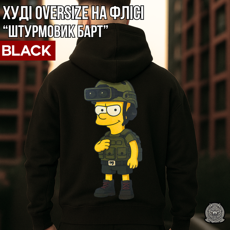 Унісекс худі «Штурмовик Барт» по мотивах мульт-серіалу "Сімпсони", відрізняється високою якістю як самого виробу, так і нанесеного принта. Oversize модель худі з круглим вирізом, капюшоном та карманом "кенгуру" без шнурка. Еластичні манжети на рукавах та в нижній частині виробу, внутрішня сторона худі - чесаний фліс. Склад основи: 90% бавовна, 10% поліестер Тип флісу: начісаний Polartec щільністю 330 мг/м2 На худі нанесений тематичний принт, тип принта — DTF. Це якісний тип друку, який дозволяє створювати яскраві та насичені зображення, а завдяки термічній обробці принт щільно вдруковується в тканину. Це робить його стійким до дії ультрафіолету, води, перепадів температури. Доступний в наступних кольорах: -Чорний - Рожевий Розмірний ряд: S, M, L, XL