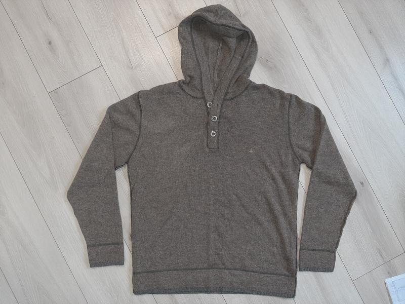 Чоловічий худі бежевого кольору, з капюшоном та брендованими металевими гудзиками , 50% вовна 35 акрил , стан нового, дуже теплий, заміри на фото.
