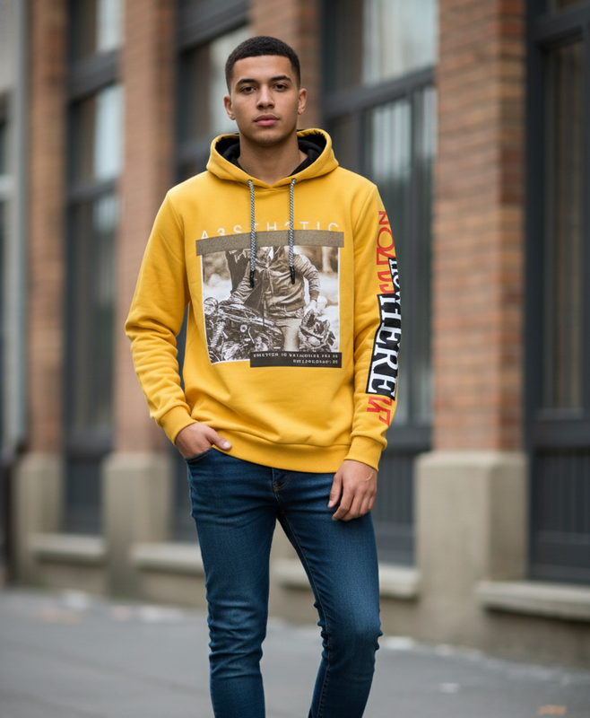 Стильне та помітне худи для тих, хто любить виділятися! Продається яскраве чоловіче худо від турецького бренду Highlander (код: 7417). Ідеальний вибір для створення сучасного та зухвалого образу. Основні характеристики та переваги: Колір: Насичений жовтий (гірчичний). Розмір: М(Medium). Бренд: Highlander (Made in Turkey). Склад матеріалу: 95% Бавовна (Cotton) - дихаючий і приємний до тіла матеріал. 5% Еластан (Elastane) - забезпечує ідеальну посадку та збереження форми. Дизайн: Великий та стильний принт з мотоциклістом та написом "AESTHETIC" на грудях. Яскравий принт з написами на рукаві ("NOW HERE" і т.д. - сфотографовані праворуч). Контрастні шнурки для каптуру (чорно-білі). М'який та щільний матеріал відмінно підходить для прохолодної погоди. Манжети та пояс у рубчик для кращої фіксації. Стан: Чудове. Без дефектів, всі шви та принти цілі. УВАГА: Прати відповідно до інструкції на бирці для збереження принта та кольору.