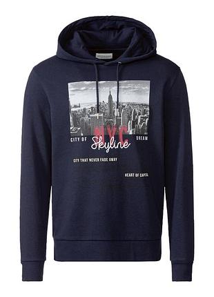 З капюшоном на шнурку. Зручний завдяки високому вмісту бавовни. З м'якою обробкою. Принт з мотивом. Звичайний крій. Матеріал: Темно-синій: 70% бавовна, 30% поліестер. Розмір: XL. Заміри на запит надам