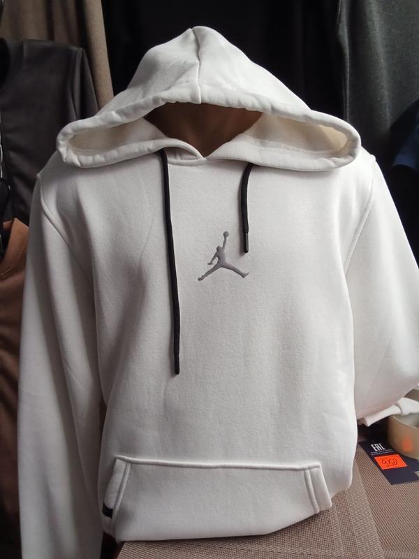 Худі білого кольору з капюшоном. М’яка, зручна та тепла. Є кишеня-кенгуру, шнурки на капюшоні, лаконічний спортивний логотип спереду. Підійде для щоденного носіння.