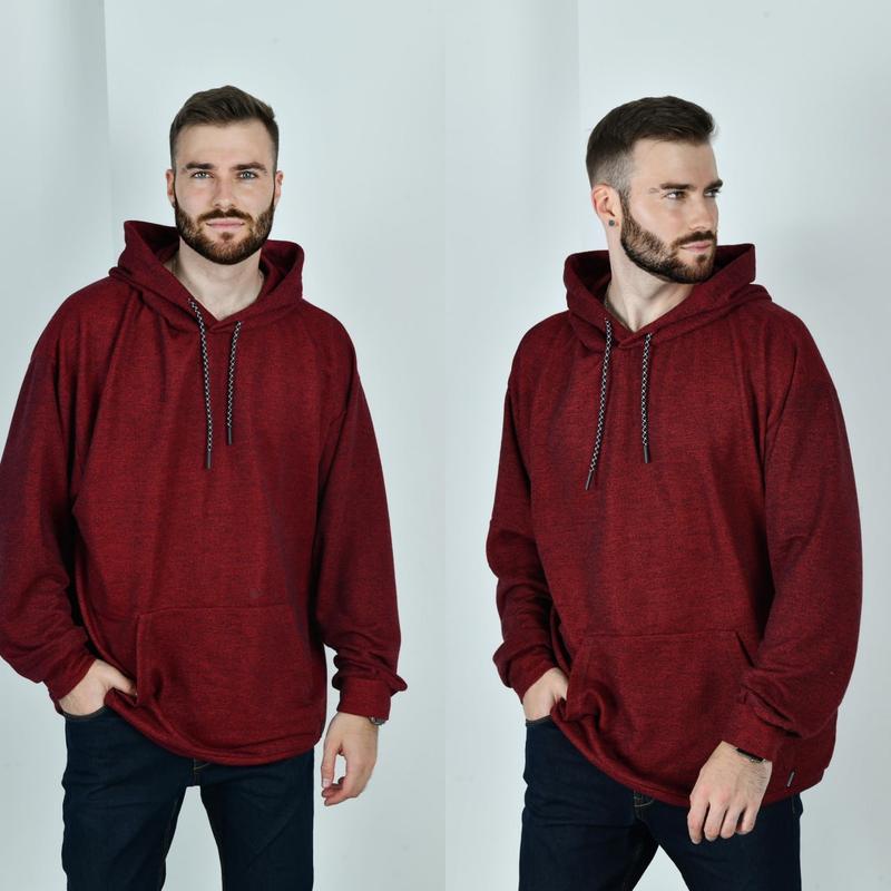 Чоловіче худі арт. nf. 3662 Тканина: трикотаж тринитка "петля" Склад: х/б 80%, поліестр 10%, еластан 10% Колір: сірий, бордо, синій, джинс Розміри: 48-50, 52-54, 56-58, 60-62, 64-66 Стильне чоловіче худі із якісного бавовняного трикотажу «петлі» (розтяжність середня). Капюшон подвійний, в куліску якого протягнуто контрастний шнурок. Лінія плеча спущена, рукав на манжеті. Попереду оброблено кишеню «кенгуру».