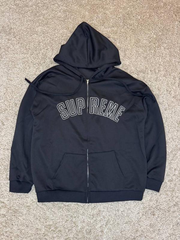 Чёрная кофта Supreme. Классический чёрный цвет, прямой крой, фирменный логотип на груди. Удобная и практичная, подходит для повседневной носки. Легко сочетается с любой одеждой.
