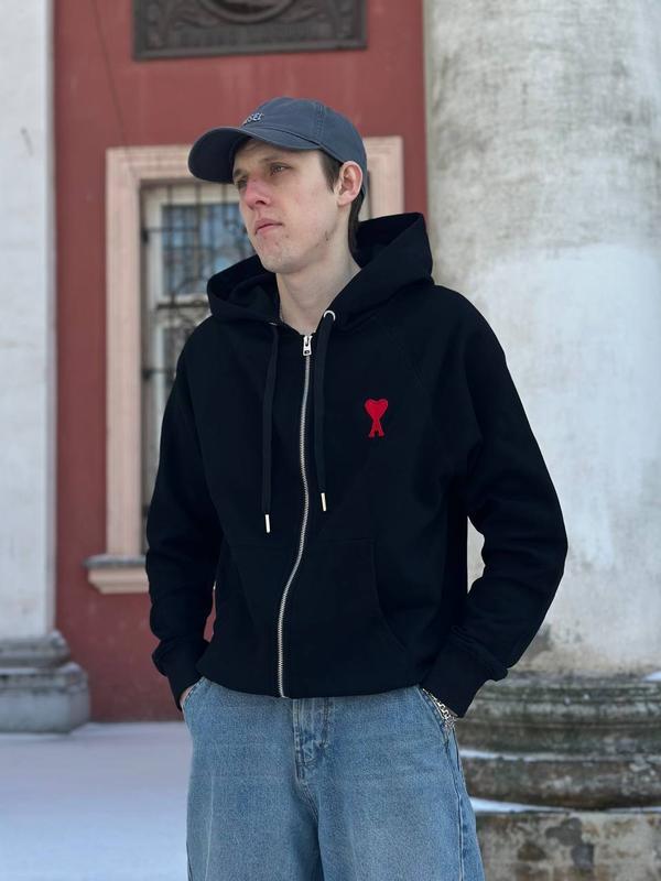Зіп-худі Ami Характеристики: -Матеріал: Хлопок 100% -Сезон: Весна/Зима/Осінь -Розмір: S,M,L (повномірки) -Колір: Чорний -Всі бірки присутні -Логотипи вишиті -Кишеня попереду -Капюшон вшитий Ціна: 1700 грн