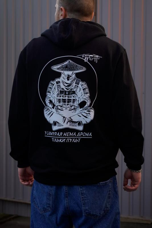 Чорне худі з потужним принтом — «У самурая нема дрона, тільки пульт». Символ сили, спокою та бойового духу сучасного воїна